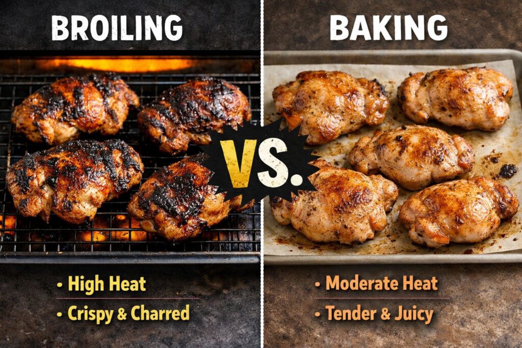 If you’re braising, baking with sauce, or cooking thighs with veggies — broiling is too aggressive.