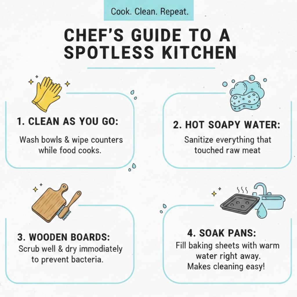 I clean as I go. If I have a minute while the chicken is browning, I wash my prep bowl. I wipe the counter.