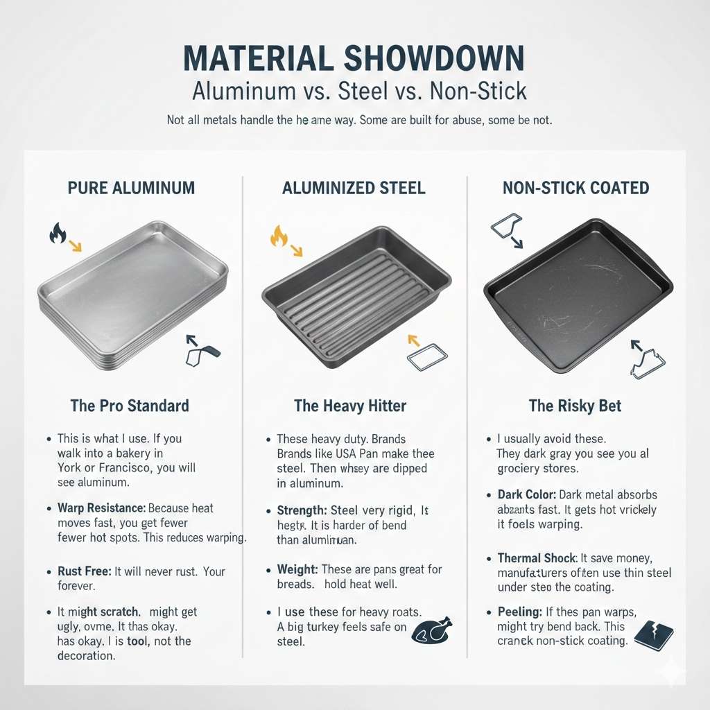 Thick pans handle heat better than thin ones. Look for heavy-gauge rimmed sheets to avoid a twist. High-quality metal stays flat. This helps you avoid the common ways warped baking sheets ruin cooking.